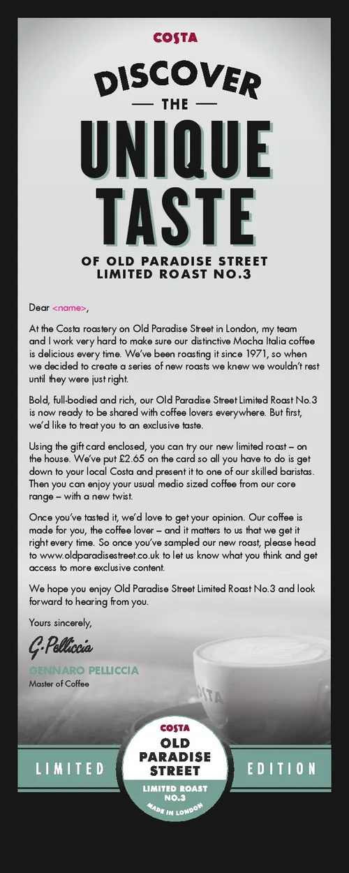 When Costa launched a new roast (quite a big deal in the world of coffee), I wrote the copy for an exclusive DM to be sent out to their Coffee Club members.